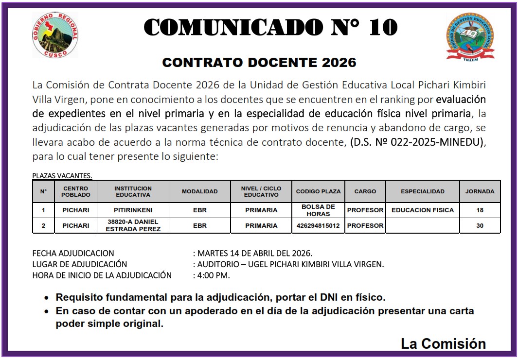 COMUNICADO-01-2026 – PROCESO DE RENOVACIÓN DE CONTRATO DOCENTE 2026 D.S. 022-2025-MINEDU/OFICIO MÚLTIPLE N° 00003-2026-MINEDU/VMGP-DIGEDD